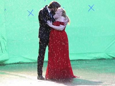 Liam hemsworth and rebel wilson were spotted kissing in the rain while filming a scene for their latest movie isnt it romantic.